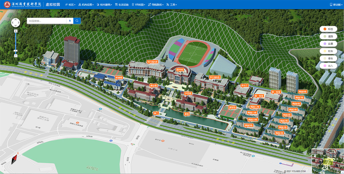 系统提供标签、道路、实景、停车场、出入口、报警点、校车停车点、充电桩等校园地图数据的分图层切换显示。